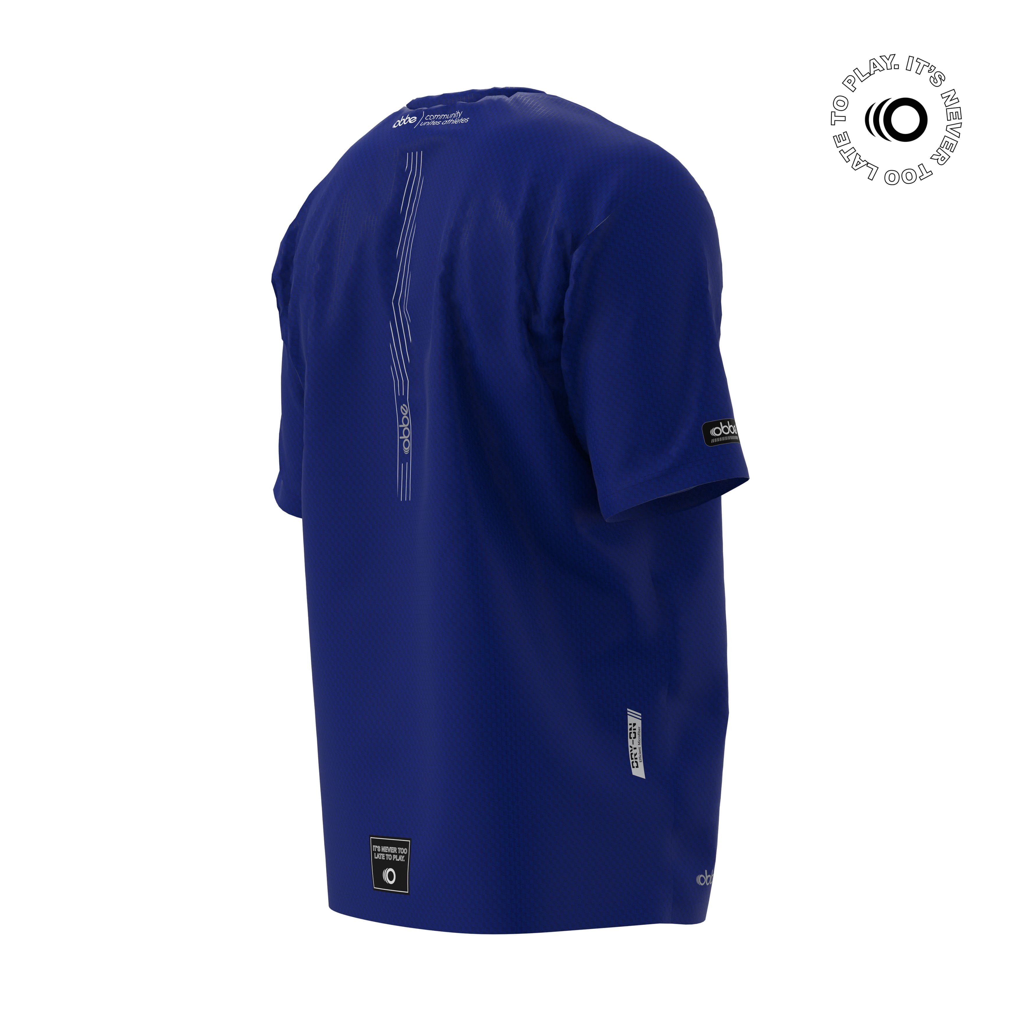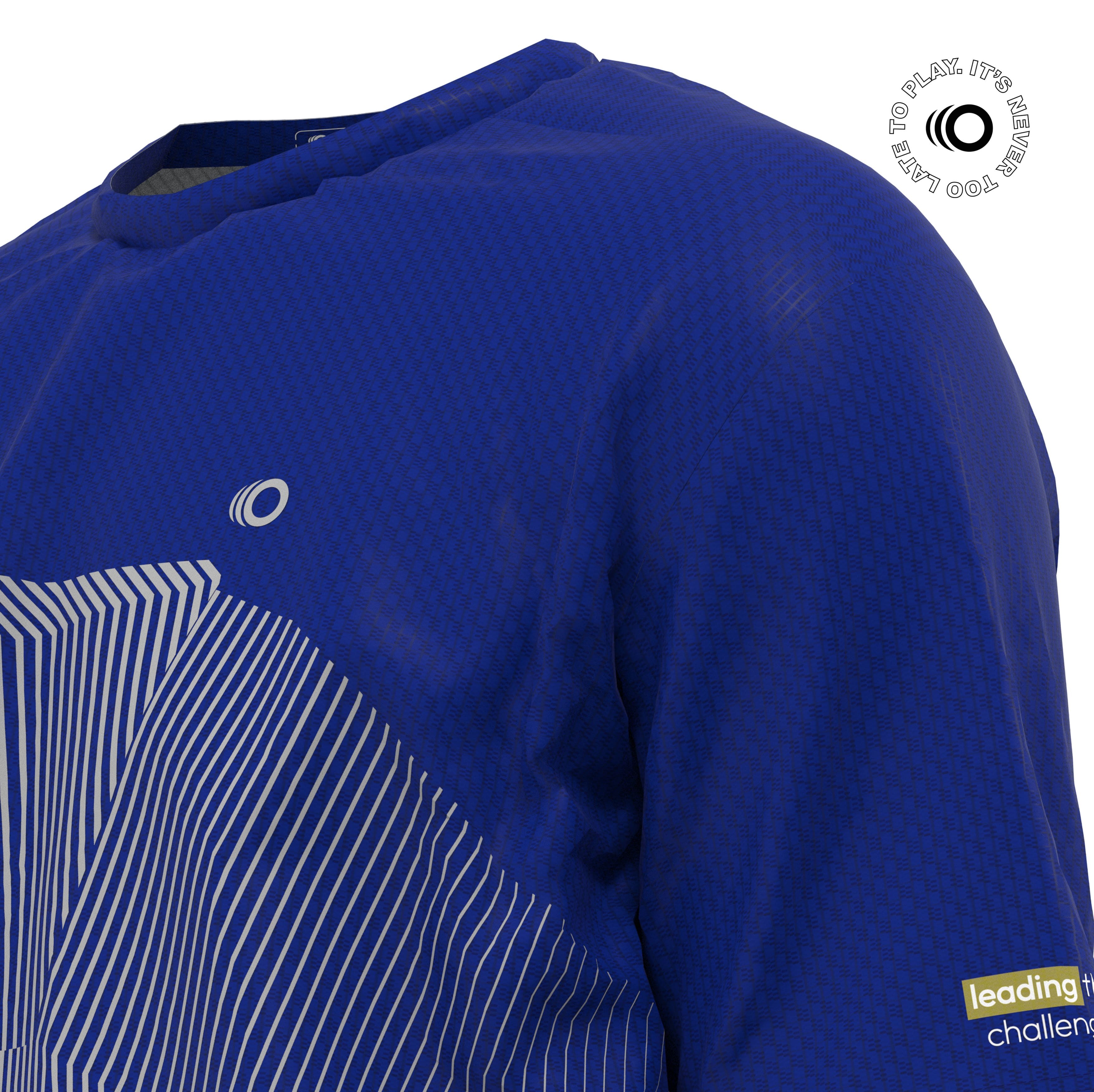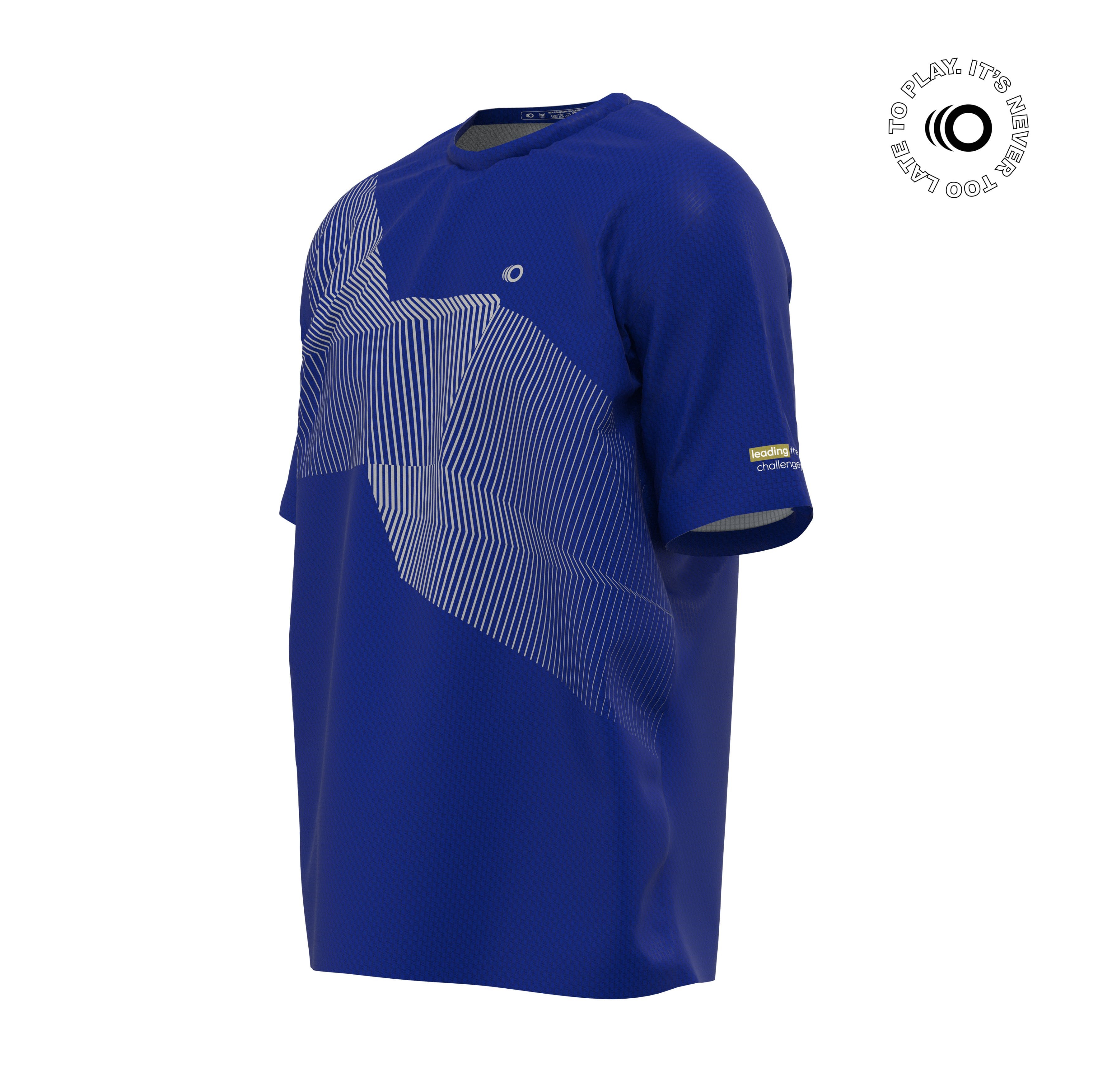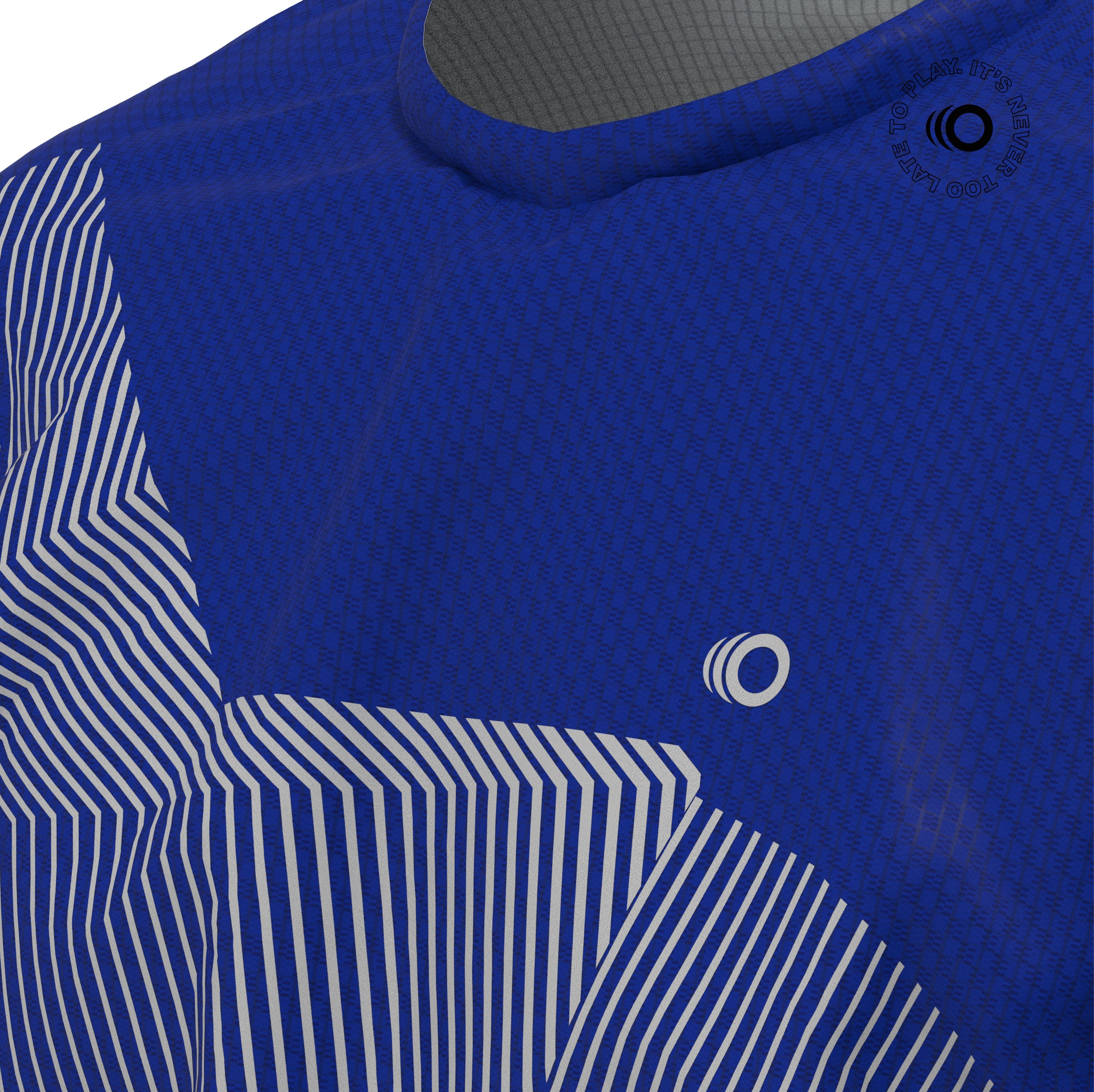 Camiseta de alto rendimiento para caballero de corte ajustado y moderno en color azul con detalles en gris claro.