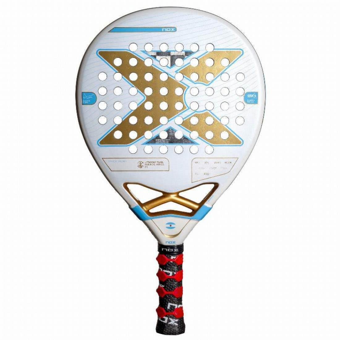 Pack Nox AT10 Luxury Genius 18K Alum Buenos Aires P1 2025REF: PACKPATORBAP1 EAN: 8435778902317Una pala que no solo golpea fuerte, también late al ritmo de su tierra.La nueva AT10 Luxury Genius 18K Alum Buenos Aires P1 2025 es mucho más que un arma de precisión: es un homenaje con alma, una edición limitada cargada de emoción, identidad y excelencia tecnológica. Diseñada y vestida con los colores celeste y blanco de la bandera argentina, esta pala conmemora el vínculo irrompible entre Agustín Tapia y sus raíces.Con un diseño exclusivo y una producción limitada, este modelo se convierte en una pieza de colección para fanáticos del pádel, pero sobre todo, en una herramienta de alto rendimiento para quienes buscan destacar en cada punto.Características principalesCarbono 18K Alum: Compuesto de carbono aluminizado de última generación que ofrece un tacto firme, uniforme y estable ante cualquier condición climática. Precisión y consistencia sin compromisos.Exclusive Spin: Superficie rugosa dual: textura 3D hexagonal en el centro y acabado tipo arena en el resto, diseñada para maximizar el control y generar golpes con efectos imposibles.Multilayered Black EVA: Núcleo multicapa de densidades variables. Responde con suavidad en defensa y con explosividad en ataque. Inteligente y equilibrada.Oversize Grip: Empuñadura alargada +30 mm, ideal para jugadores que emplean golpes a dos manos o buscan mayor palanca sin perder confort.Dynamic Composite Structure (DCS): Estructura que refuerza la unión entre marco y cara para evitar grietas y garantizar una durabilidad superior.Smartstrap: Sistema de cordón de agarre reemplazable, higiénico, personalizable y práctico. Un detalle que marca la diferencia.Pulse System: Inserciones de goma estratégicas que reducen vibraciones y cuidan tu brazo partido tras partido.EOS Flap: Diseño de perforación lateral que mejora la aerodinámica, equilibra el peso y proporciona una manejabilidad explosiva.NOX Custom Grip: Tecnología patentada que mejora el agarre y reduce las vibraciones. Más control, menos fatiga.Carbon Frame: Marco de carbono reforzado que aporta rigidez, resistencia y prolonga la vida útil de la pala.Conclusión:La Nox AT10 Luxury Genius 18K Alum Buenos Aires P1 2025 no es una pala cualquiera: es una joya técnica envuelta en pasión. Creada para quienes sienten el pádel como una extensión de su identidad, y diseñada con el aval del mismísimo Agustín Tapia, esta edición limitada no solo rinde homenaje a la cuna del campeón, sino que ofrece una experiencia de juego a la altura de los más exigentes.La caja inlcuye: 1 Llavero replica1 Cordón Nox azul1 Overgrip Nox Blanco1 Overgrip Nox Negro