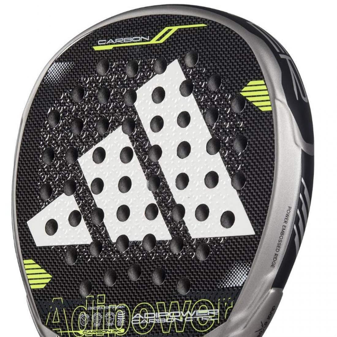 Pala Adidas Adipower Carbon Control 2025REF: AR1CA3 EAN: 8435739402832La Adidas Adipower Carbon Control 2025 es una pala de pádel diseñada para jugadores avanzados y profesionales que buscan el máximo control en cada golpe sin renunciar a la potencia. Con una estructura innovadora y materiales de alta gama, esta pala ofrece precisión, manejabilidad y un rendimiento excepcional en cualquier situación del juego.Características Principales:Material de la superficie: Fabricada con Carbono 18K, este material premium proporciona una excelente rigidez y respuesta, maximizando la precisión y la potencia en golpes controlados. El carbono 18K asegura una mayor durabilidad y un tacto sólido en cada golpe.Forma: De forma redonda, con un balance bajo y un amplio punto dulce, esta pala está diseñada para favorecer el control y la precisión, siendo ideal para jugadores que priorizan la seguridad en el golpeo y el manejo en cada jugada.Goma EVA de baja densidad: Su núcleo de goma EVA Soft Performance ofrece un tacto más suave, absorbiendo vibraciones y mejorando la comodidad en cada golpe, al tiempo que proporciona una salida de bola controlada y progresiva.SMART HOLES CURVE: Sistema de perforación estratégica que optimiza la distribución de los agujeros en la pala, mejorando el control y ampliando el punto dulce. Esta disposición permite una mayor versatilidad en el golpeo y facilita los efectos.Relieve 3D: Superficie rugosa diseñada para potenciar los golpes con efecto y mejorar el control de la bola en jugadas técnicas, especialmente en golpes liftados y cortados.Tecnologías Destacadas:Dual Exoskeleton: Refuerzo de carbono ubicado en el corazón de la pala que mejora la rigidez torsional, proporcionando una mayor estabilidad en el golpeo y maximizando la potencia en los golpes ofensivos sin perder precisión.Nervio de carbono externo: Ubicado en el marco, este refuerzo estructural añade resistencia adicional y durabilidad a la pala, al tiempo que mejora su estabilidad, permitiendo una mayor precisión en golpes exigentes.Beneficios:La Adidas Adipower Carbon Control 2025 es ideal para jugadores que buscan precisión y control en cada golpe, gracias a su forma redonda, su balance bajo y su tecnología avanzada. Su construcción en carbono 18K y refuerzos como el Dual Exoskeleton y el nervio externo de carbono garantizan durabilidad, potencia y estabilidad, mientras que el núcleo de goma EVA de baja densidad aporta comodidad y suavidad en el golpeo.Es la pala perfecta para quienes buscan dominar la pista con golpes precisos y controlados, sin renunciar a la potencia en los momentos clave del juego.
