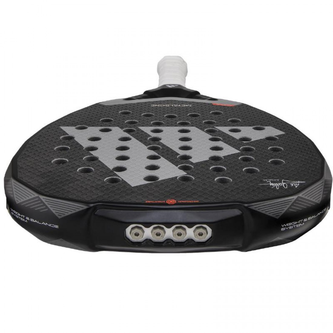 Pala Adidas Ale Galan Metalbone 3.4 2025REF: AR1AA0 EAN: 8435739402740La Adidas Ale Galán Metalbone 3.4 2025 es la pala oficial del jugador profesional Alejandro Galán, diseñada para ofrecer un rendimiento excepcional en la pista. Creada con tecnología de última generación y materiales premium, esta pala está orientada a jugadores avanzados y profesionales que buscan máxima potencia, precisión y adaptabilidad en cada golpe.Características Principales:1. Material de la superficie: Fabricada con carbono aluminizado 16K, que proporciona una mayor rigidez y potencia en el golpeo. Este material garantiza una excelente durabilidad y una respuesta explosiva, ideal para golpes de ataque.2. Forma: Con una forma de diamante, esta pala tiene un balance alto, lo que potencia los golpes agresivos y la velocidad de la bola, siendo ideal para jugadores que dominan un juego ofensivo.3. Peso ajustable: Incorpora el sistema WEIGHT & BALANCE SYSTEM METALBONE, que permite ajustar el peso y el balance de la pala a través de unos tornillos en el marco. Esto permite personalizar la pala para adaptarse al estilo de juego del jugador.4. Goma EVA Soft Performance: Núcleo con goma EVA de baja densidad, que proporciona un tacto suave y una gran salida de bola, ofreciendo confort y un excelente control en golpes más técnicos.5. Tecnología SPIN BLADE DECAL: Superficie rugosa que mejora el agarre de la bola, permitiendo realizar golpes con efectos de manera precisa y eficaz.6. Power Extra Grip: Sistema que optimiza la potencia y el control en golpes de alta intensidad, ideal para jugadores que buscan un rendimiento explosivo en sus remates.7. Octagonal Structure: Diseño estructural único con refuerzos octagonales que aumentan la rigidez de la pala, ofreciendo mayor potencia y estabilidad en cada golpe.8. Low Poly Power Groove: El diseño poliédrico del marco y corazón de la pala aporta mayor rigidez y potencia en los golpes.Tecnologías Destacadas:WEIGHT & BALANCE SYSTEM METALBONE: Ajusta el peso y el balance de la pala según tus preferencias, permitiendo personalizar la manejabilidad y el estilo de juego.SPIN BLADE DECAL: Superficie texturizada que maximiza los efectos en golpes liftados y cortados, mejorando el control sobre la bola.CARBONO ALUMINIZADO 16K: Material premium que garantiza una respuesta rápida y potente, proporcionando una combinación perfecta de rigidez y flexibilidad.EVA Soft Performance: Núcleo de baja densidad que ofrece una sensación de comodidad, reduciendo las vibraciones y aumentando el control en cada golpe.Octagonal Structure: Refuerzos estratégicos en el marco que mejoran la estabilidad y la rigidez, optimizando la potencia en golpes agresivos.Power Extra Grip: Tecnología diseñada para ofrecer una mayor adherencia de la bola y potenciar la precisión en golpes de alta velocidad.Beneficios:Potencia extrema: La combinación de materiales avanzados y su diseño en forma de diamante maximiza la potencia en golpes de ataque, como remates y bandejas.Personalización: El sistema de peso ajustable permite adaptar la pala al estilo de juego, proporcionando una experiencia completamente personalizada.Control y efectos: La textura SPIN BLADE DECAL y el núcleo EVA Soft Performance facilitan un excelente control y permiten ejecutar golpes con efecto de forma precisa.Durabilidad: El carbono aluminizado 16K y las tecnologías estructurales aseguran una larga vida útil, incluso en partidos exigentes.La Adidas Ale Galán Metalbone 3.4 2025 es la elección perfecta para jugadores que buscan una pala de alto rendimiento, capaz de ofrecer una potencia inigualable y un control excepcional. Diseñada para los más exigentes, esta pala combina tecnología avanzada, materiales de primera calidad y personalización, siendo ideal para dominar cada aspecto del juego.En la pala va incluido los tornillos en los laterales de la pala aumentando su peso 11.2 gramos. Peso de la web es sin tornillos.
