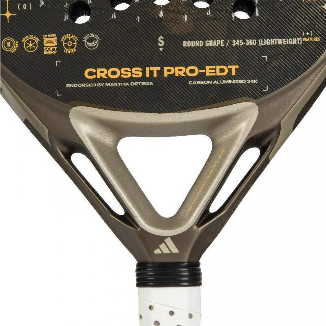 Pala Adidas Marta Ortega Cross It Pro Edt 2025REF: AR1CA9 EAN: 8435739405697Descubre la potencia celestial y el control absoluto en cada golpe con la nueva Adidas Marta Ortega Cross It Pro Edt 2025, una pala que nace de la inspiración de una diosa: Venus. Elegante, precisa y tremendamente efectiva, esta edición especial representa el equilibrio perfecto entre tecnología de vanguardia y un diseño que brilla con luz propia.Diseñada para jugadoras exigentes que buscan un rendimiento profesional sin sacrificar ligereza ni maniobrabilidad, esta pala te lleva directo al siguiente nivel.Características principales:Carbono Aluminizado 24KSu superficie está fabricada con carbono aluminizado 24K, una combinación que ofrece una salida de bola explosiva y una resistencia excepcional al desgaste, garantizando máxima durabilidad y un rendimiento constante en cada partido.LightweightGracias a su peso optimizado, esta pala es increíblemente ligera, lo que permite una mayor agilidad en la red, una mejor reacción defensiva y una comodidad superior incluso en los partidos más intensos.Forma Redonda (Round Shape)Su formato redondo con sweet spot centrado ofrece un control total, ideal para jugadoras que quieren colocar la bola con precisión quirúrgica y mantener el dominio del ritmo de juego.Spin BladeIncorpora la exclusiva tecnología Spin Blade que añade una superficie rugosa, pensada para maximizar los efectos y darle a tus golpes esa rotación letal que desconcierta a cualquier rival.Eva Density Soft EnergySu núcleo está compuesto por goma Eva Soft Energy, que proporciona una sensación suave al impacto, mayor salida de bola y una extraordinaria absorción de vibraciones, cuidando tu brazo mientras refuerza cada punto con energía.Dynamic Air FlowInnovador sistema de canalización de aire en el marco que mejora la aerodinámica y reduce la resistencia al mover la pala, facilitando movimientos más rápidos, fluidos y naturales.Conclusión:La Adidas Marta Ortega Cross It Pro Edt 2025 no es solo una pala de pádel, es una declaración de intenciones. Elegante como Venus, letal como el juego de Marta Ortega, y diseñada para quienes dominan la pista con clase y carácter. Perfecta para jugadoras técnicas que no renuncian a la potencia, esta pala se convierte en una extensión de tu talento.Haz que tu juego brille en cada punto y deja una huella imborrable en cada partido.
