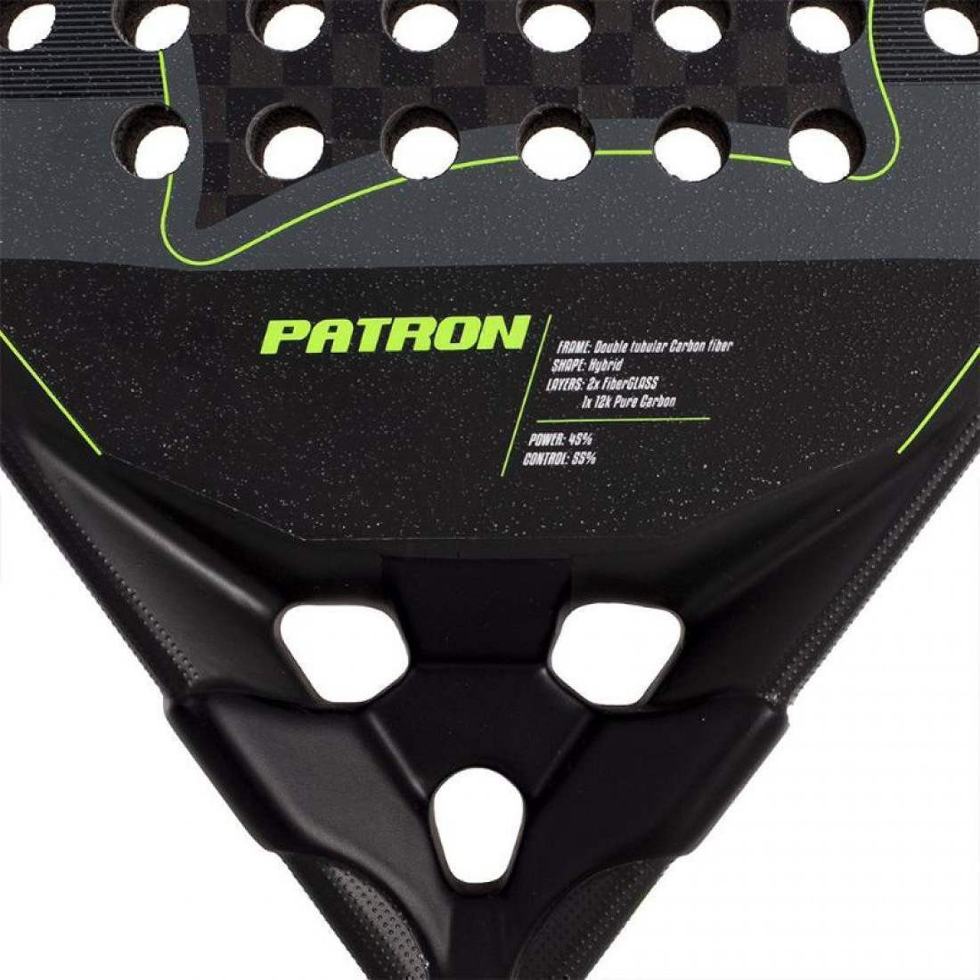 REF: 001815BC EAN: 8445090115135El modelo Patron combina tecnología innovadora, materiales de alta calidad y un diseño elegante.Su composición incluye dos capas de fibra de vidrio y una última capa de carbono 12k, proporcionando una combinación perfecta de potencia, control y durabilidad.Experimenta la comodidad y la respuesta precisa gracias a la goma EVA de dureza media en el núcleo de la pala.Esta elección de material asegura una absorción efectiva de impactos y una sensación de juego excepcional, ideal para jugadores de todos los niveles.Incorpora un anti vibrador en el lateral. Minimiza las vibraciones no deseadas.El detalle distintivo de la superficie rugosa tipo arena proporciona un agarre excepcional a la pelota.Descubre el equilibrio perfecto entre potencia, control y confort.Peso: 355 a 370 grs.Marco 38 mm. Perfil constante.Forma hibridoMarco tubular carbonoNúcleo interior: 12k CarbonGoma: PSM EvaPotencia: 45%Control: 55%