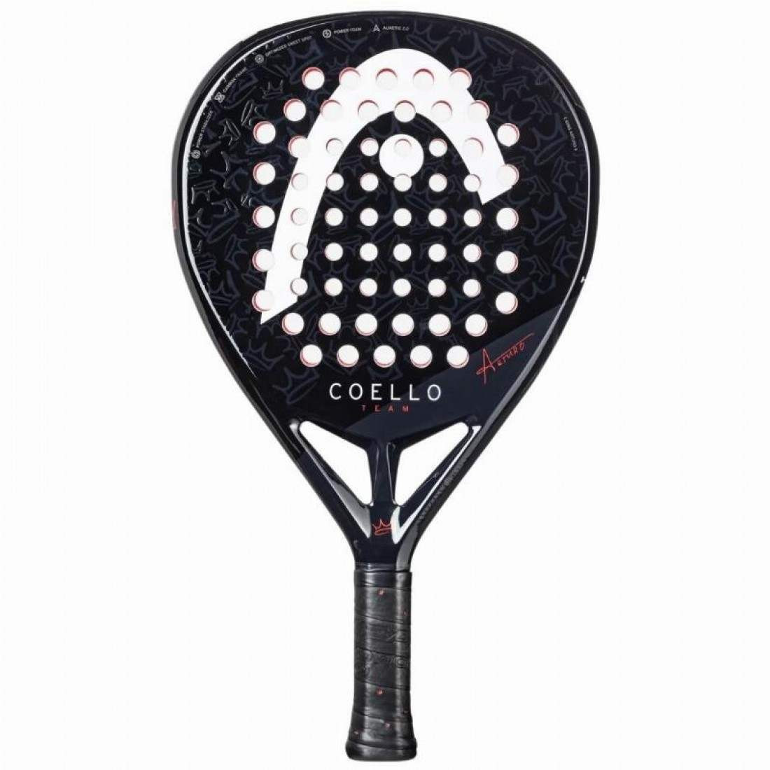 Pala Head Arturo Coello Team 2025REF: 225035 EAN: 198772015756La Head Arturo Coello Team 2025 es la pala perfecta para quienes buscan un equilibrio entre potencia, control y comodidad en la pista. Diseñada en colaboración con el número uno del mundo, Arturo Coello, este modelo destaca por su rigidez más suave dentro de la gama del campeón, permitiendo golpes explosivos sin perder maniobrabilidad ni estabilidad.Con un elegante diseño en forma de diamante, esta pala ha sido creada para jugadores de nivel intermedio y avanzado que desean mejorar su juego ofensivo con una potencia fácil a velocidades de bola más bajas. Su estructura combina innovación y materiales de alta calidad, asegurando un rendimiento excepcional en cada golpe.Tecnologías destacadas:Auxetic 2.0: Una evolución en la tecnología de absorción de impactos, mejorando la sensación de golpeo y optimizando la transferencia de energía desde la cara de la pala hasta la mano.Permite mayor precisión y confort en cada impacto.Power Foam: Una espuma reactiva que maximiza la potencia en golpes ofensivos como el smash, X3, X4 y víbora, proporcionando un rebote más explosivo y una mayor respuesta en el juego rápido.Optimized Sweet Spot: El diseño de los agujeros ha sido estratégicamente distribuido para ampliar el punto dulce, asegurando mayor facilidad de golpeo en toda la superficie de la pala.Carbon Frame: Construcción de marco de carbono que proporciona mayor rigidez y reactividad, maximizando la transmisión de energía en cada golpe.Power Stabilizer: Un sistema diseñado para mejorar la estabilidad de la pala en swings rápidos, aportando mayor control sin perder potencia.Graphene Inside: La incorporación de Graphene refuerza el marco, optimiza la salida de bola y aumenta la resistencia de la pala para un rendimiento más duradero.Anti Shock Skin Padel: Un protector especial de polímero que prolonga la vida útil de la pala al protegerla contra golpes y arañazos. Se puede reemplazar fácilmente para mantener la pala en óptimas condiciones.Diseño exclusivo:Inspirada en el talento y agresividad de Arturo Coello, esta pala no solo ofrece un rendimiento superior, sino que también destaca por su estética premium. Incorpora detalles personales del jugador, como su logotipo de corona y firma, combinados con un acabado brillante y llamativo que refleja su dominio en la pista.Conclusión:La Head Arturo Coello Team 2025 es la pala ideal para jugadores que buscan potencia sin esfuerzo, estabilidad en la red y una sensación inigualable en cada golpe. Su combinación de tecnologías innovadoras la convierte en una herramienta de alto rendimiento para quienes desean perfeccionar su juego ofensivo. Con la confianza del número uno del mundo, esta pala es una apuesta segura para dominar la pista con potencia y precisión.