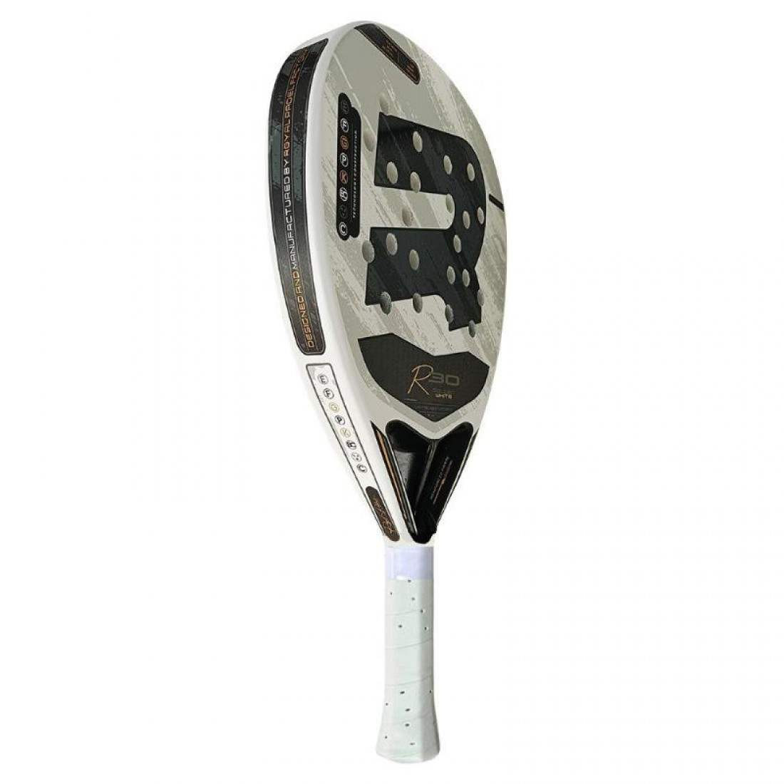 Pala Royal Padel R30 LTD Blanco Dorado 2025La Royal Padel R30 LTD Blanco Dorado 2025 es una pala de pádel de diseño exclusivo y prestaciones avanzadas, ideal para jugadores de nivel intermedio y avanzado que buscan un juego dinámico y potente. Su forma de diamante y balance alto la convierten en una pala enfocada en la potencia, perfecta para jugadores que dominan el ataque y buscan definir los puntos con golpes contundentes.Características PrincipalesForma: Diamante, con un punto dulce situado en la parte superior de la pala, ideal para maximizar la potencia en los golpes de ataque.Balance: Alto, lo que favorece una mayor inercia y potencia en los golpes más agresivos, ideal para jugadores ofensivos que buscan dominar desde el fondo o cerca de la red.Material del núcleo: Núcleo de polietileno, que ofrece una excelente absorción de vibraciones, proporcionando un tacto suave y cómodo. Este material permite una mayor salida de bola con un control destacado.Caras: Fabricadas con fibra de vidrio, lo que aporta flexibilidad y ayuda a mantener un control superior sin comprometer la potencia, siendo ideal para un juego equilibrado.Superficie: Texturizada en 3D, diseñada para mejorar el agarre de la bola y facilitar los golpes con efecto, lo que brinda una ventaja estratégica en situaciones ofensivas y defensivas.Marco reforzado: Construcción robusta que mejora la durabilidad de la pala y proporciona mayor estabilidad estructural, ideal para resistir el desgaste del juego intensivo.Tecnologías DestacadasReinforced Frame: Refuerzo adicional en el marco que aumenta la resistencia frente a impactos, proporcionando mayor estabilidad y prolongando la vida útil de la pala.High Balance Power: Distribución de peso enfocada en la parte superior de la pala para maximizar la potencia en los golpes.Shock Absorption Core: Núcleo de polietileno diseñado para reducir las vibraciones, proporcionando un juego más cómodo y minimizando el riesgo de lesiones.3D Surface Grip: Textura rugosa que potencia los efectos y ofrece un mejor control en los golpes con efecto liftado o cortado.Golden Touch Design: Diseño exclusivo en tonos blanco y dorado que combina elegancia con un enfoque en el rendimiento, ideal para jugadores que buscan destacar tanto en estética como en juego.¿Por Qué Elegirla?La Royal Padel R30 LTD Blanco Dorado 2025 es la elección perfecta para jugadores ofensivos que buscan una pala con gran potencia y un diseño llamativo.Su núcleo de polietileno y superficie de fibra de vidrio proporcionan una combinación de control, comodidad y potencia, mientras que su superficie 3D agrega un plus de efectos al juego. Con su marco reforzado y balance alto, es ideal para quienes quieren dominar la pista con estilo y precisión.