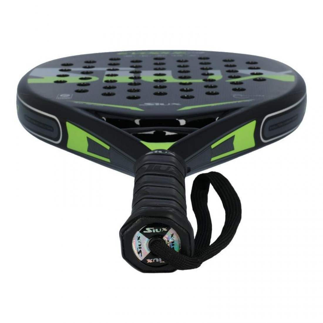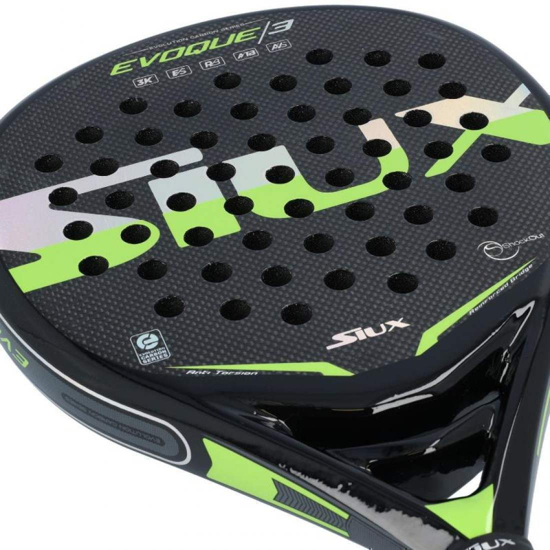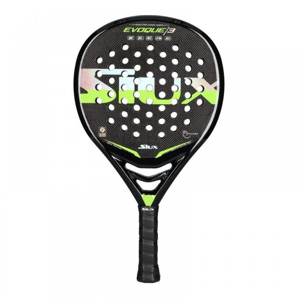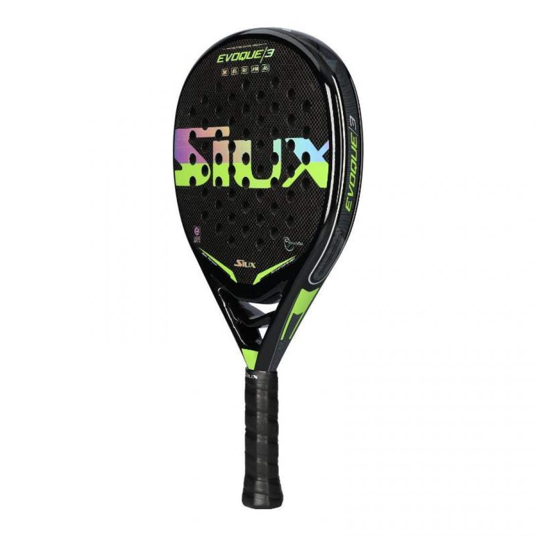 Pala Siux Evoque 3REF: A004003 EAN: 8435536752277Descubre la Siux Evoque 3, una pala de pádel que fusiona innovación y diseño para ofrecerte una experiencia de juego inigualable. Diseñada para jugadores de nivel intermedio a avanzado que buscan un equilibrio perfecto entre potencia y control, esta pala se convertirá en tu aliada ideal en la pista.Materiales de Alta CalidadMarco: Construido con una combinación de 50% carbono y 50% fibra de vidrio, el marco de la Evoque 3 proporciona una estructura robusta y duradera, asegurando resistencia y flexibilidad en cada golpe.Planos: Las caras de la pala están elaboradas con carbono 3K, un material que aporta mayor rigidez y respuesta, ofreciendo una sensación de golpeo más firme y precisa.Núcleo: Incorpora una goma EVA en su núcleo, proporcionando una excelente amortiguación y una rápida recuperación, lo que se traduce en un tacto medio que equilibra potencia y control.Diseño y FormaCon una forma de lágrima y un balance medio, la Siux Evoque 3 ofrece un amplio punto dulce, facilitando el control de la bola y permitiendo una mayor precisión en tus golpes. Su peso oscila entre 355 y 375 gramos, ofreciendo una manejabilidad óptima para adaptarse a diferentes estilos de juego.Tecnologías IncorporadasSistema Antivibración: Incorpora tecnologías que reducen las vibraciones, proporcionando un juego más cómodo y disminuyendo el riesgo de lesiones.Acabado Brillante: Su acabado brillante no solo le confiere una estética atractiva, sino que también mejora la durabilidad de la superficie.Rendimiento en la PistaLa Siux Evoque 3 destaca por su polivalencia, respondiendo eficazmente tanto en situaciones ofensivas como defensivas. Su construcción y materiales permiten una excelente salida de bola y una notable precisión en cada golpe, adaptándose a las exigencias del juego moderno.ConclusiónLa Siux Evoque 3 es una pala que combina materiales de alta calidad y un diseño meticuloso para ofrecer un rendimiento superior en la pista. Ideal para jugadores que buscan una herramienta versátil que les permita dominar cada aspecto del juego, desde potentes remates hasta precisos golpes de control. Con la Evoque 3, estarás equipado para llevar tu juego al siguiente nivel.