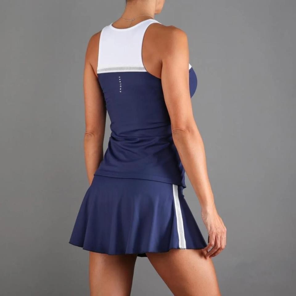 • Falda con vuelo con cintura alta ergonómica que aumenta la sujeción y «disimula el volumen abdominal.»